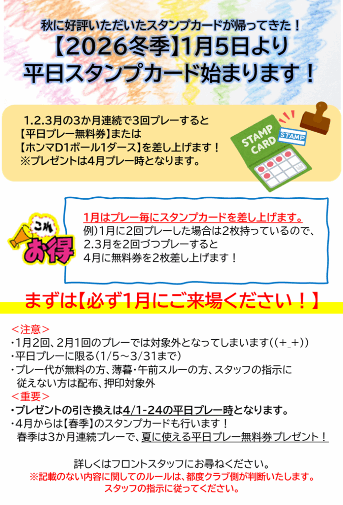 Informationお知らせ TOP > INFORMATION > 2026.1月~平日スタンプカード開始! 一覧ページへ戻る 2026/01/15 2026.1月~平日スタンプカード開始! 平日3か月連続来場スタンプカード配布中! 期間:2026年1.2.3月の3か月 スタンプカードの配布は、1月中で終了です! 1月にプレーに来てください!! 冬季プレゼントの引き換えは、4/1~4/24までの平日プレー時となります! 皆さまのご来場お待ちいたしております★ <対象外の例> ・プレー代が無料の方 ・休日に来場の方 ・プレーをしない方 ・薄暮・午前スルーの方 上記の場合は、スタンプカードの配布、押印はいたしません。 一覧ページへ戻る ACCESS DRESS CODE